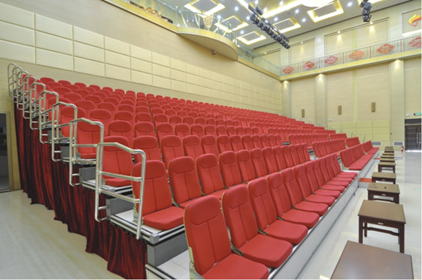 Eigenschaft von teleskopischen Bleacher-Sitzplätzen: Die meisten der teleskopischen Tribünesitzplätze werden in den Konferenzsaal, Auditoriumshalle und -stadion, Turnhalle oder irgendein pubilc Sportzentrum gelegt. Er kann geschlossen sein und öffnete sich durch elektrische Steuerung.