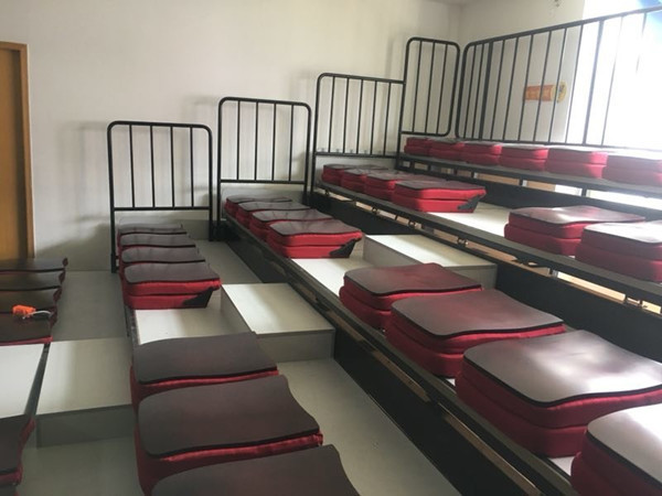 (5) hat die Front des einziehbaren Bleacher einen schönen Auftritt, und es gibt rutschfeste Streifen auf dem Bleacher, zum des Publikums an auf und ab gleiten zu hindern.